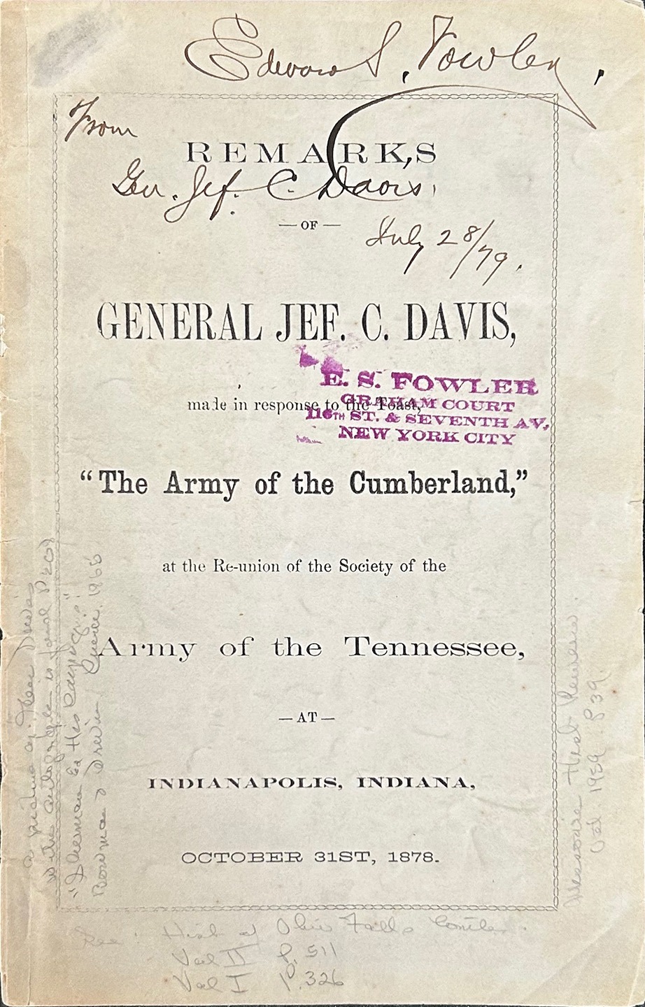 Jefferson C. Davis, Remarks of General Jeff. C. Davis… Signed