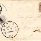 An Abraham Lincoln illustrated campaign envelope, the upper left corner features Lincoln as the Republican presidential candidate. The image taken by C. S. German in Springfield, September 26, 1858 (O-9). Below is a facsimile of Lincoln’s signature. The addressed envelope was posted by a supporter from Gardiner, (Maine?) less than 6 weeks before the election.