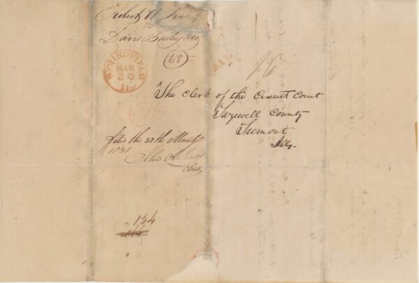 Abraham Lincoln-Legal. Tazwell Circuit Court, Springfield: 29 March 1838. “Robert W. Keys vs David Bailey, (et al).” Folio; 1p. + address leaf to the Clerk of the court in “Tremont, Ills.” w/ a Springfield postal round stamp; very small remnant of its original wax seal.