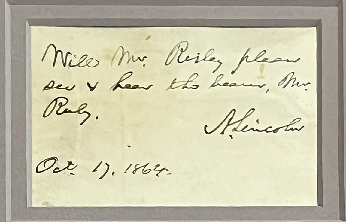 LINCOLN, ABRAHAM. Autograph Note, Signed. Washington, 17 Oct. 1864. 4″ x 4″ (sight); framed with modern reprint of O-77; overall size 16 1/2″ x 11″.