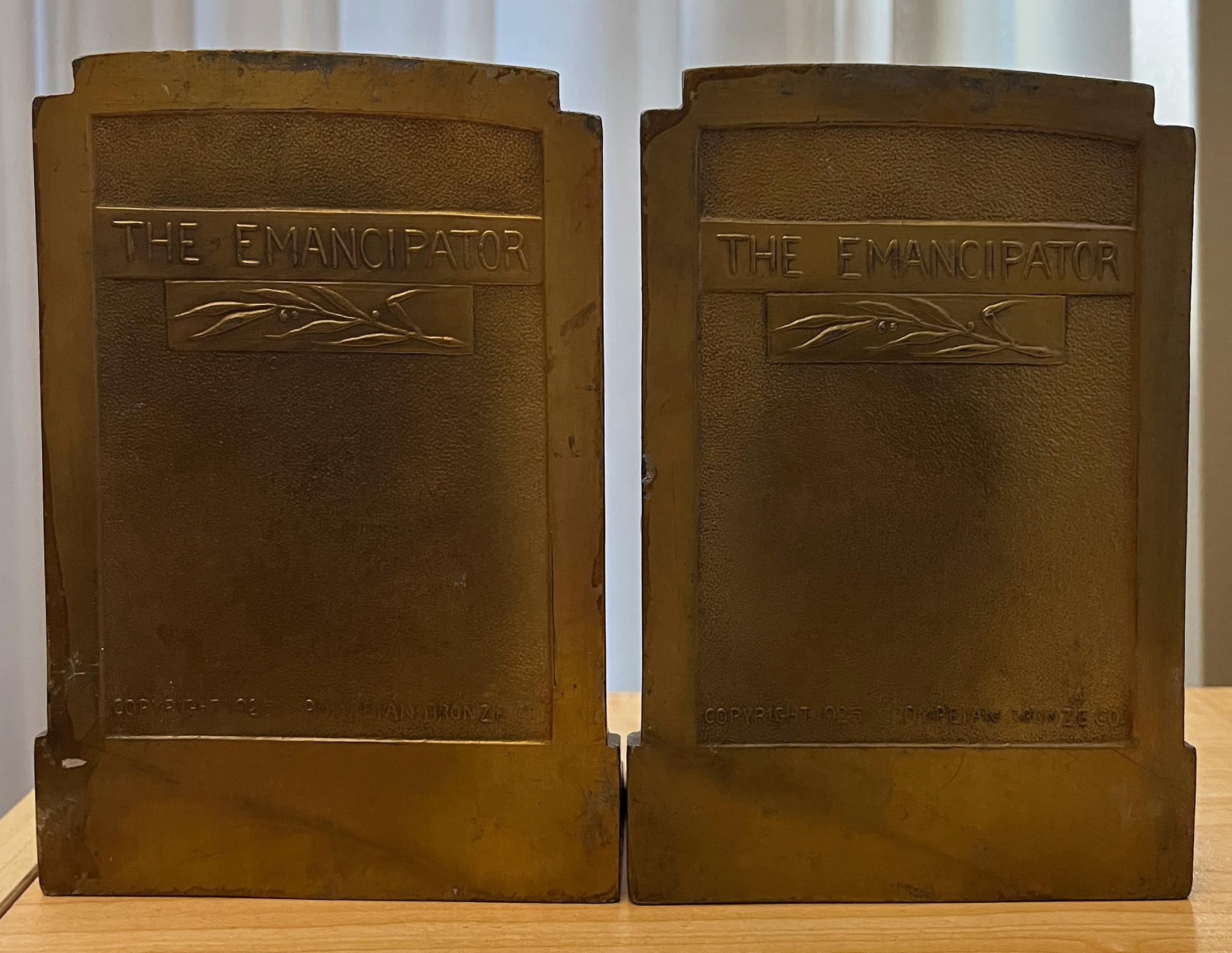The back features the title The Emancipator with an olive branch below. Further down, the words read Copyright 1925 / Pompeian Bronze Company.