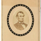 The carte de visite of Lincoln is based on O-92, the Five Dollar Bill pose. An oval cut out of an albumen photo of Lincoln is surrounded by a black ring of stars, indicating this is a mourning piece.