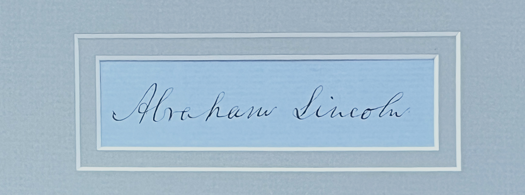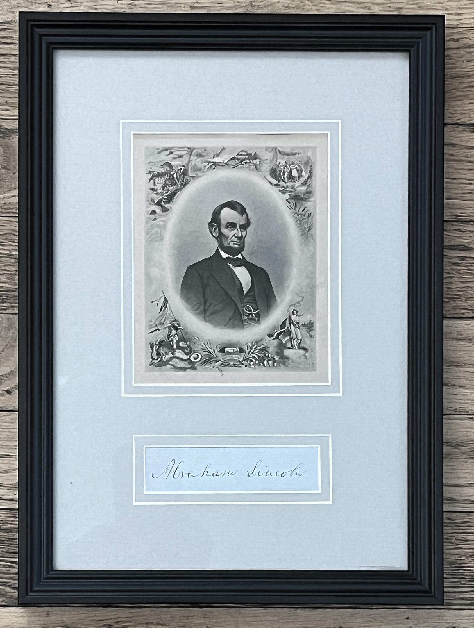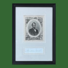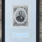 Lincoln, Abraham. Signature on blue paper; with engraving; signature is 6″ x 3″ (sight); overall the piece is 13 1/2″ x 9 3/4″. Matted and framed.