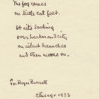Sandburg, Carl (1878-1967; Poet) “FOG” Autograph Poem, signed “For Roger Barrett / Chicago 1933 / Carl Sandburg.” Fair copy; 5-12/8” x 8-1/4” on buff paper. Inscribed to the son of the great Lincoln collector, Oliver Barrett, whose fabulous collection Sandburg used in writing his Prairie Years. $5,500