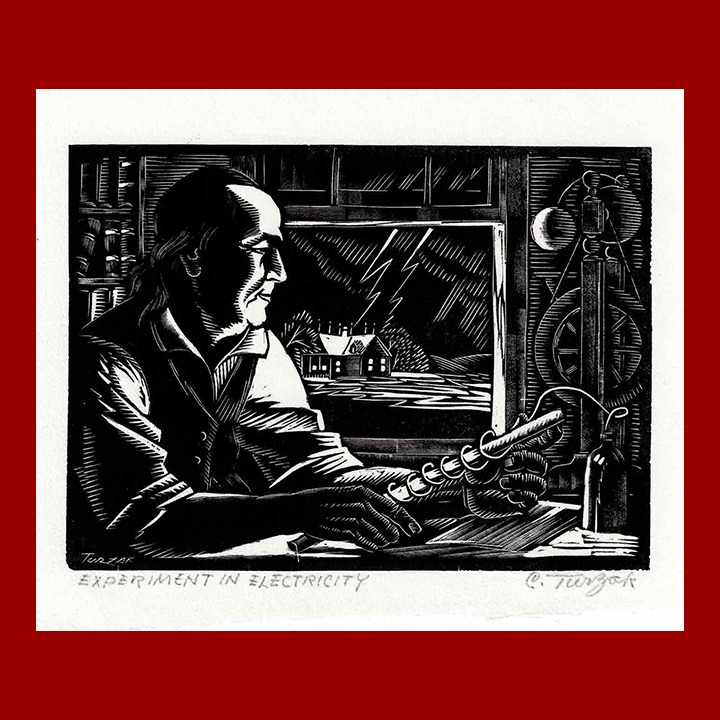 Charles Turzak, Benjamin Franklin, Experiment in Electricity, Woodcut Print