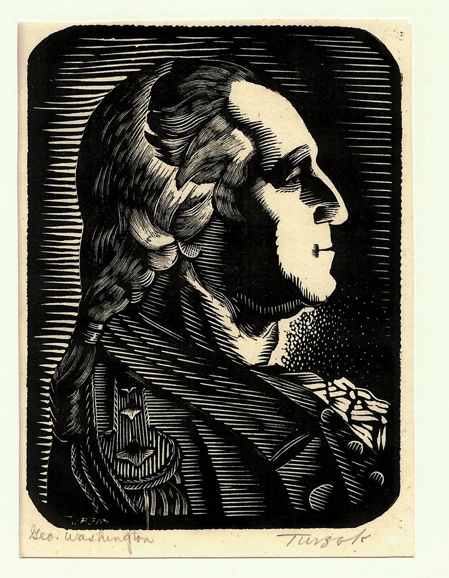 George Washington, Geo. Washington. Woodcut on paper, 1938; 4” x 5 1/4.” Signed and titled in pencil; Artist’s pulled proof.