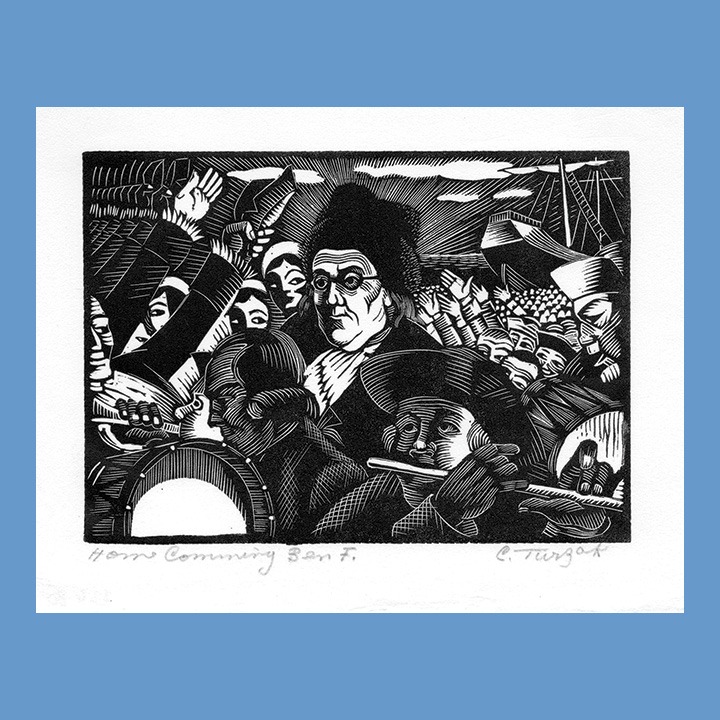 Charles Turzak, Home Coming of Benjamin Franklin, Woodcut Print