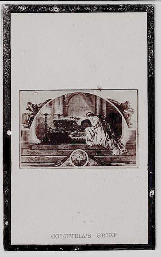 From the moment this image was published (Harper’s Weekly, April 26, 1865), Thomas Nast’s Columbia Weeps Over the Casket of Lincoln it became a potent image of our nation’s collective grief. We have seen a variety of applications and formats.This one was printed by Salisbury, Bro. & Co., in Providence, Rhode Island.