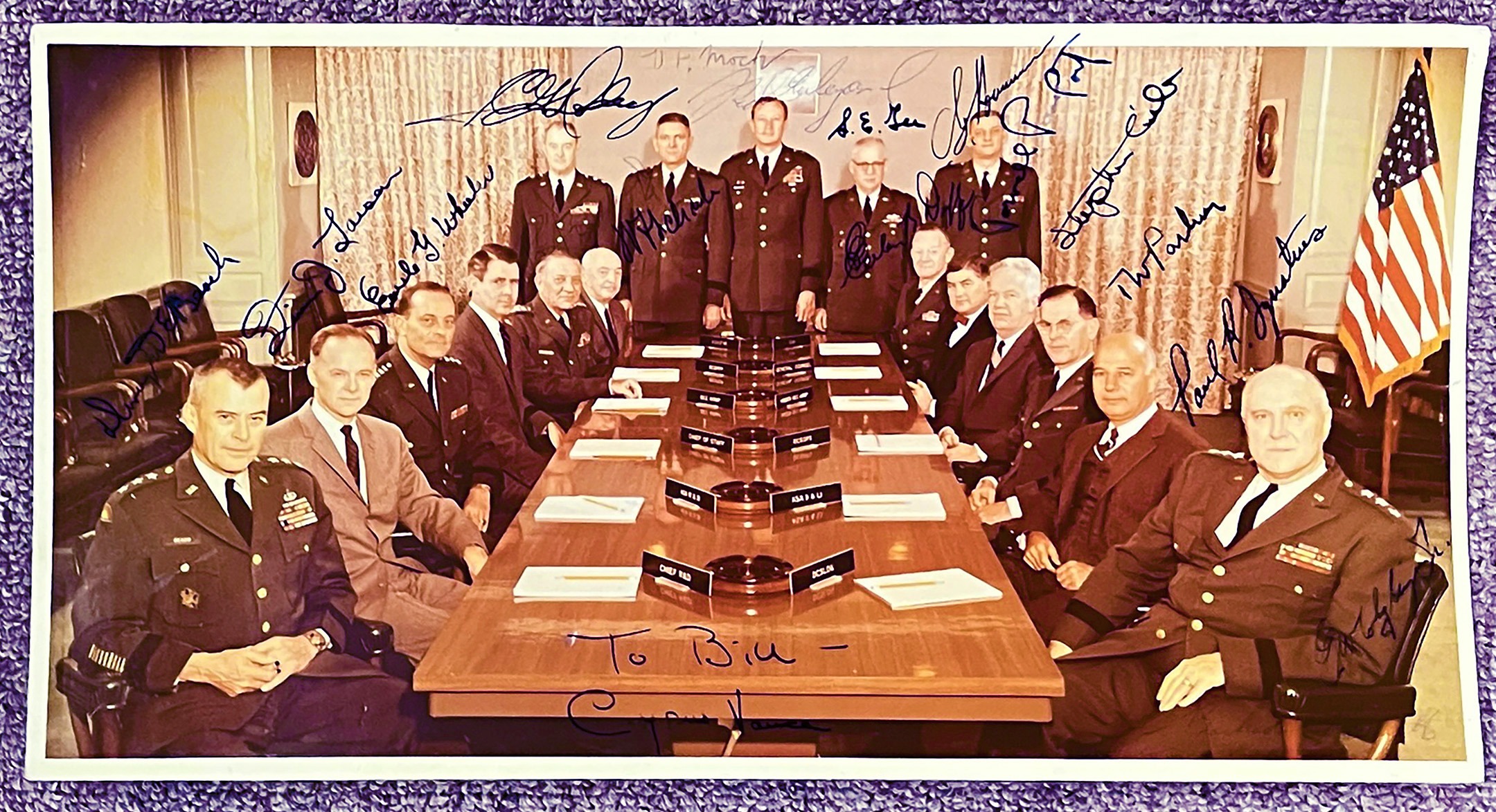 This photograph, signed by the members of the 1963 members of the American Policy Council, is inscribed by the Secretary of the Army, Cyrus Vance “To Bill / Cyrus Vance”