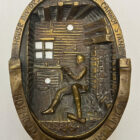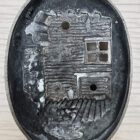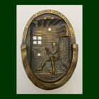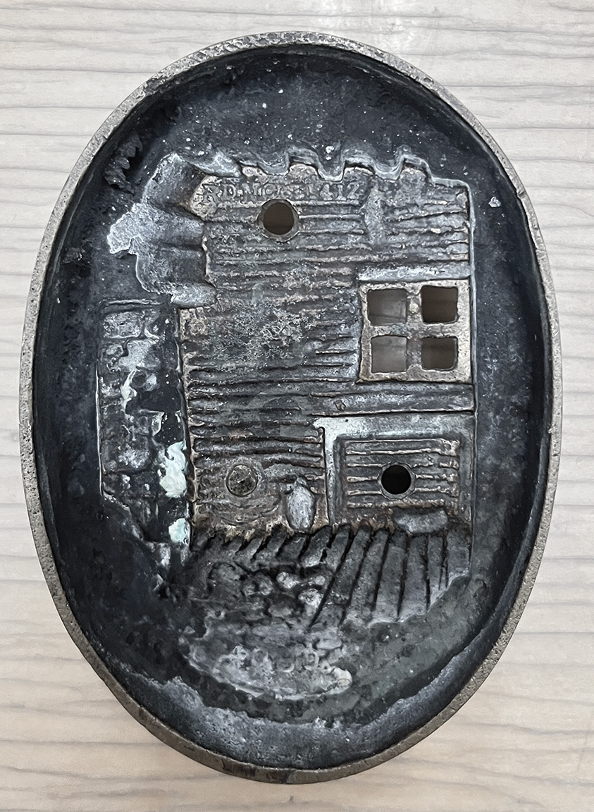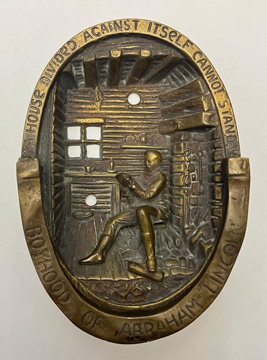This door knocker appears to be brass. It features the classic Lincoln Boyhood Home image of Lincoln as a boy, reading by the fireplace. The logs of the rough hewn home are clearly rendered, as well as the bricks of the hearth. The sink has a beautifully rendered mug and a candlestick; with a small dish shelf mounted on the wall near by. The top bears the words “A House Divided Against Itself Cannot Stand.” The bottom reads “Boyhood Home of Abraham Lincoln.”
