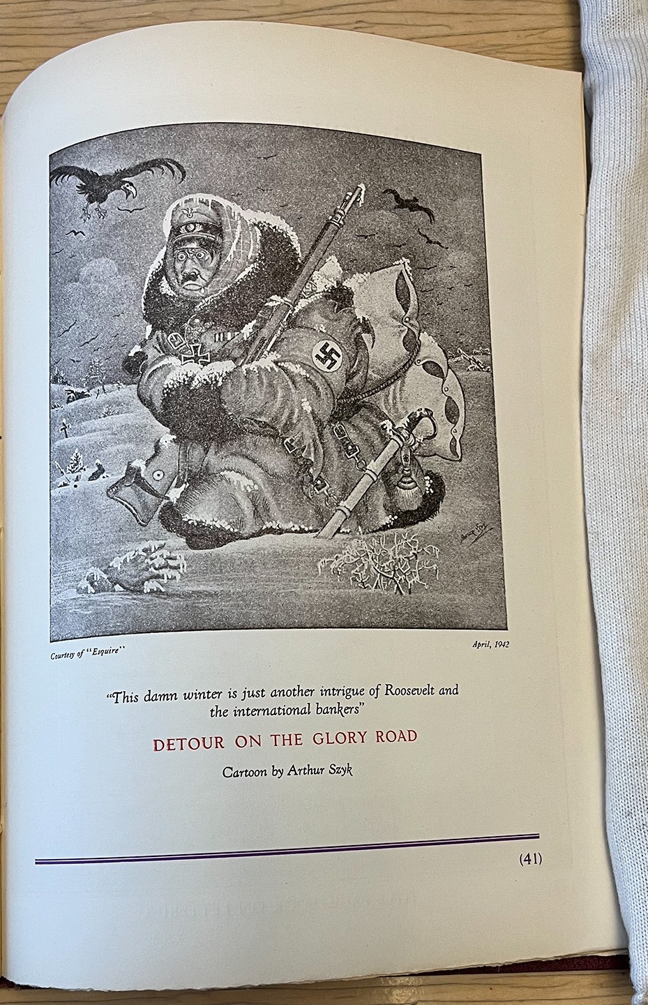 A number of cartoons by artist Arthur Szyk are also reproduced that lampoon Adolph Hitler and his ambitions which were then just starting to fail.