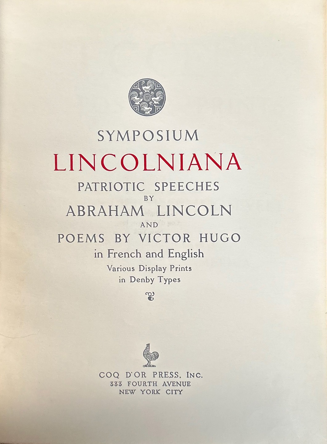 Denby, Edwin H. Symposium Lincolniana: Patriotic Speeches by Abraham Lincoln and Poems by Victor Hugo in French and English. Various Display Prints in Denby Types. New York: Coq D’or Press, 1942. Limited edition #12/400, 48(2)p., illustrations.
