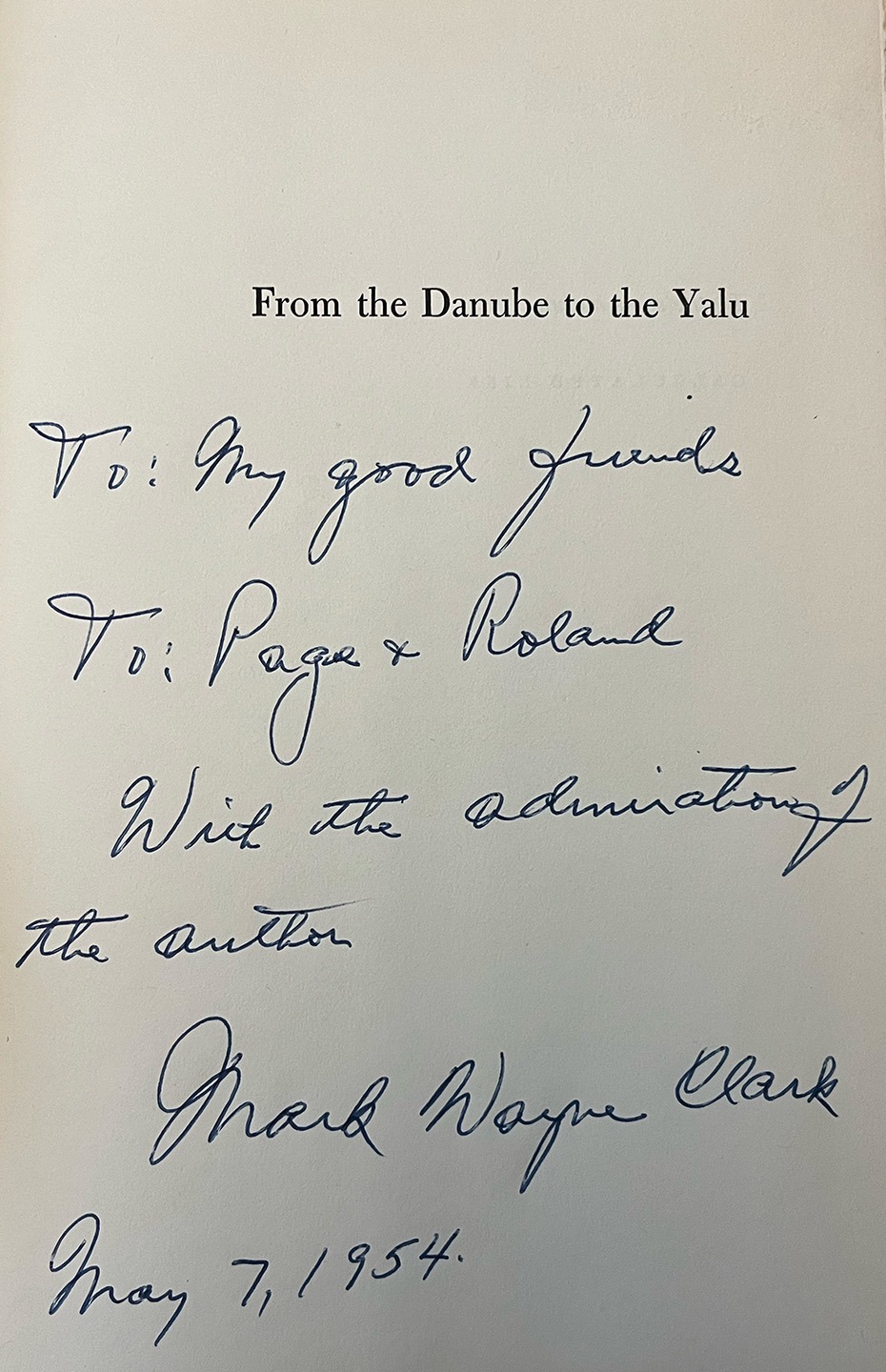 Lightly worn, sunned & rubbed dust jacket; else very good condition. This copy inscribed and signed by General Clark “To: My good friends / To: Page & Roland / With the admiration of / the author / (signed) / May 7, 1954.”