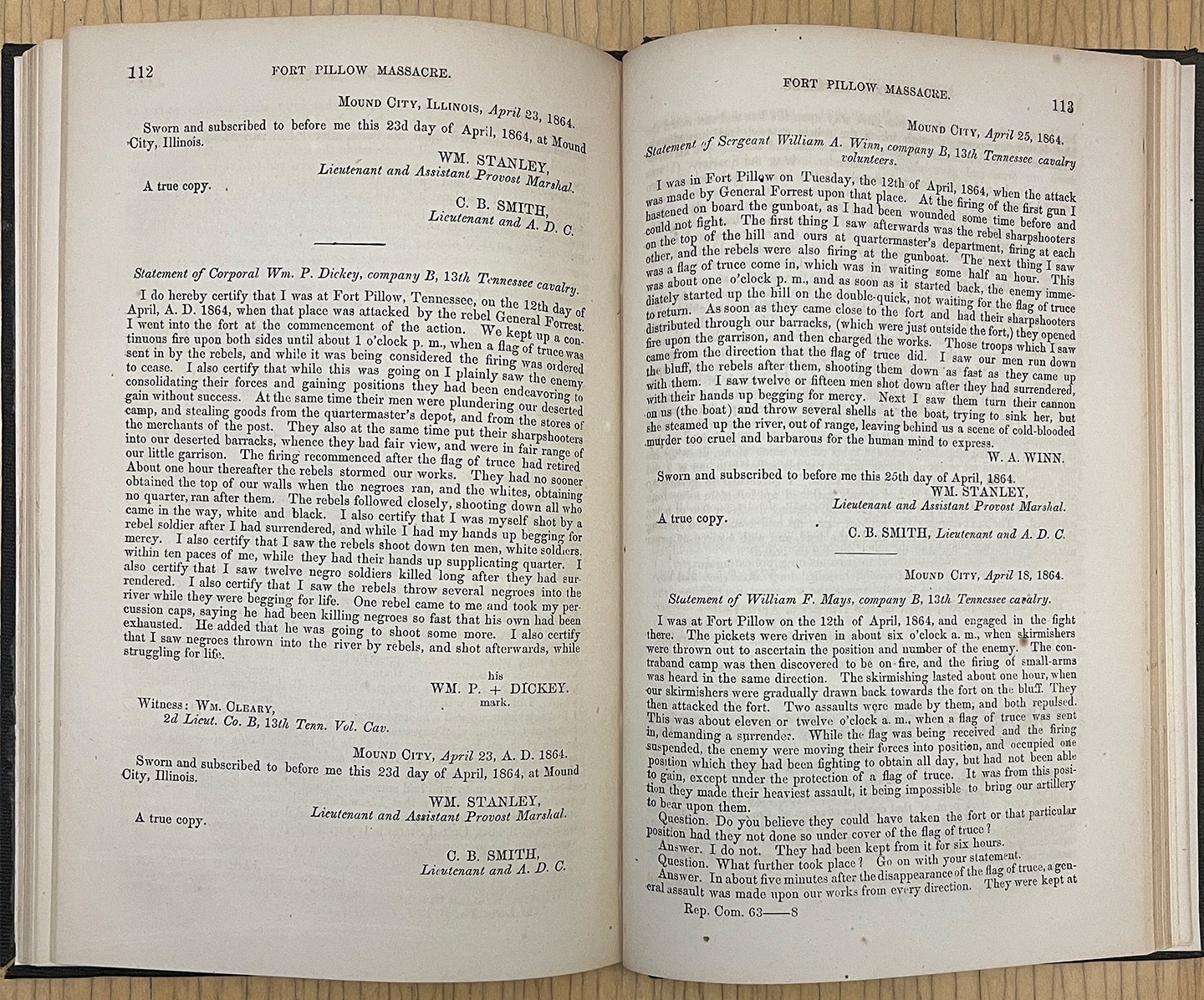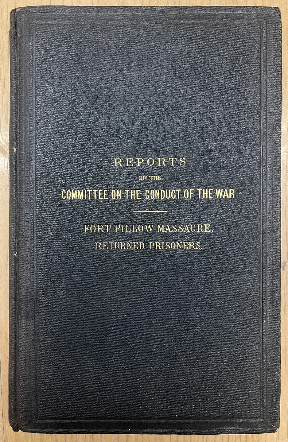 U. S. House of Representatives. Reports of the Committee on the Conduct of the War: Fort Pillow Massacre. Returned Prisoners. Washington DC: Government Printing Office, 1864. 1st edition, 128p./34(8)p., engravings.