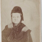 This Mary Lincoln carte is commonly called the notorious “spirit” photo. It shows Mary Lincoln at half-length, seated, in her widow’s dress; a ghostly image of her husband stands behind, with one hand on each of her shoulders.