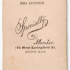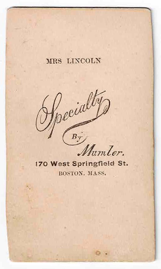 Wm. H. Mumler specialized in such pictures and, although once exposed by Harper’s Weekly, continued to find gullible clients such as Mrs. Lincoln. Taken circa 1872, this was the last known photo ever taken of Mrs. Lincoln. A scarce artifact!