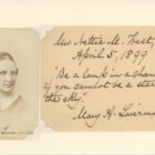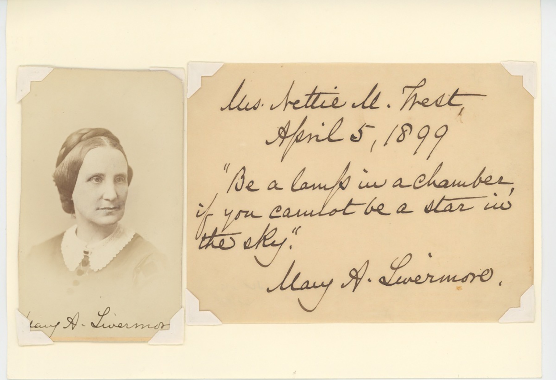 Livermore, Mary A. Carte de Visite, signed and Autograph Quotation signed; 5 April 1899; n.p., Carte is 4″ x 3.1/2″, quote is 5″ x 4″ (approx). Both pieces are attached to 7 1/2″ x 5 1/2″ sheet with corner tabs. In excellent condition.
