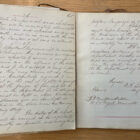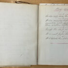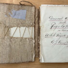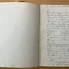 Sewn burlap covering over the original boards. Hand-written title pasted onto front board; hinges cracked; some pages loose; quite readable writing throughout.