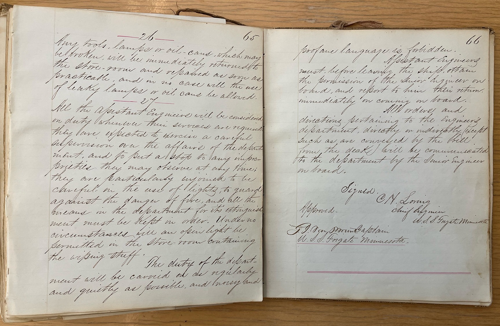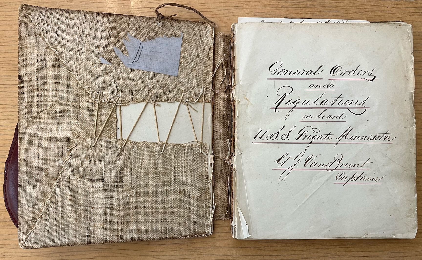 (Monitor & Merrimac) GENERAL ORDERS AND REGULATIONS ON BOARD S. S. FRIGATE MINNESOTA / G. J. VAN BRUNT CAPTAIN. Manuscript Memorandum Book, Signed as Approved, “G. J. Van Brunt Captain”, on page 66. 6-3/4’ x 8-1/4”; 68 numbered pages.