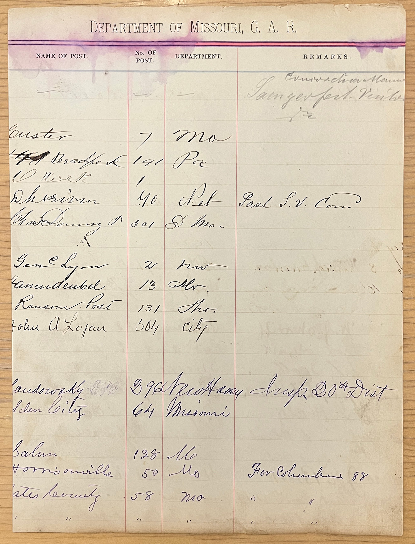 Bickerdyke, Mary Ann Ball “Mother” (1817-1901; Civil War Nurse) Visitors Register Frank P. Blair Post No. 1 / Department of Missouri, G.A.R: Signed “Mrs. M. A. Bickerdyke / Bunker Hill / Russell Co / Kans.” on 19 September 1888.