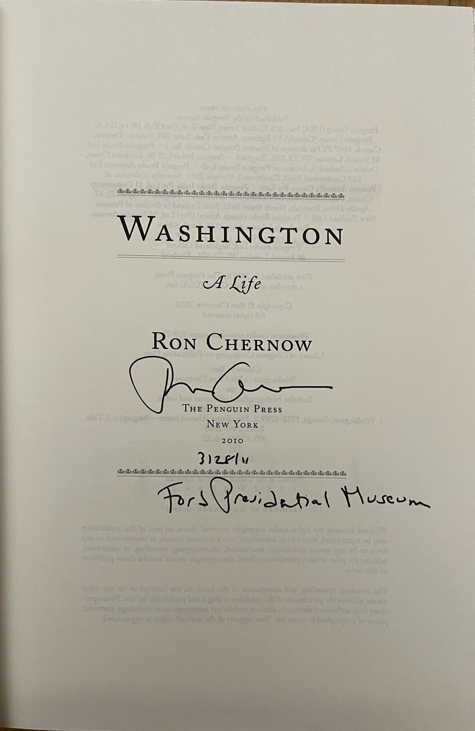 Chernow, Ron. WASHINGTON: A LIFE. NY: Penguin Press, 2010. 1st Ed.; 904p.; illustrated. Signed Directly.