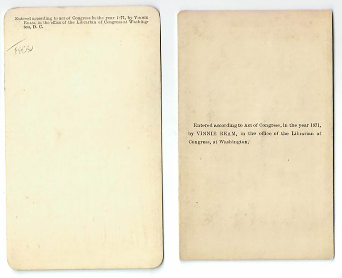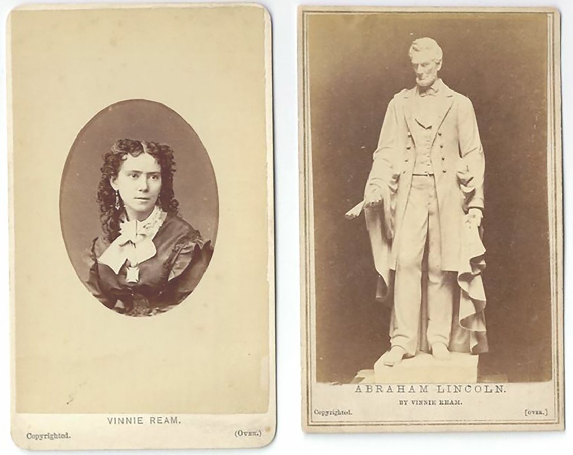 Two cartes de visite, one is of Vinnie Ream a noted Lincoln sculptor and the other is of the statue she created of Abraham Lincoln.