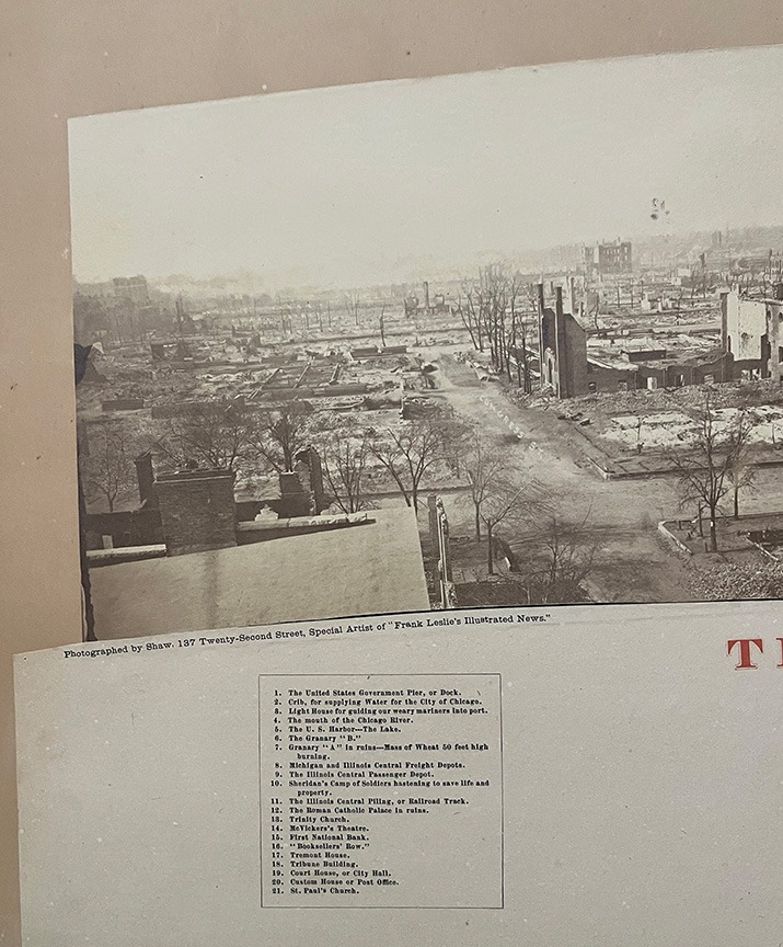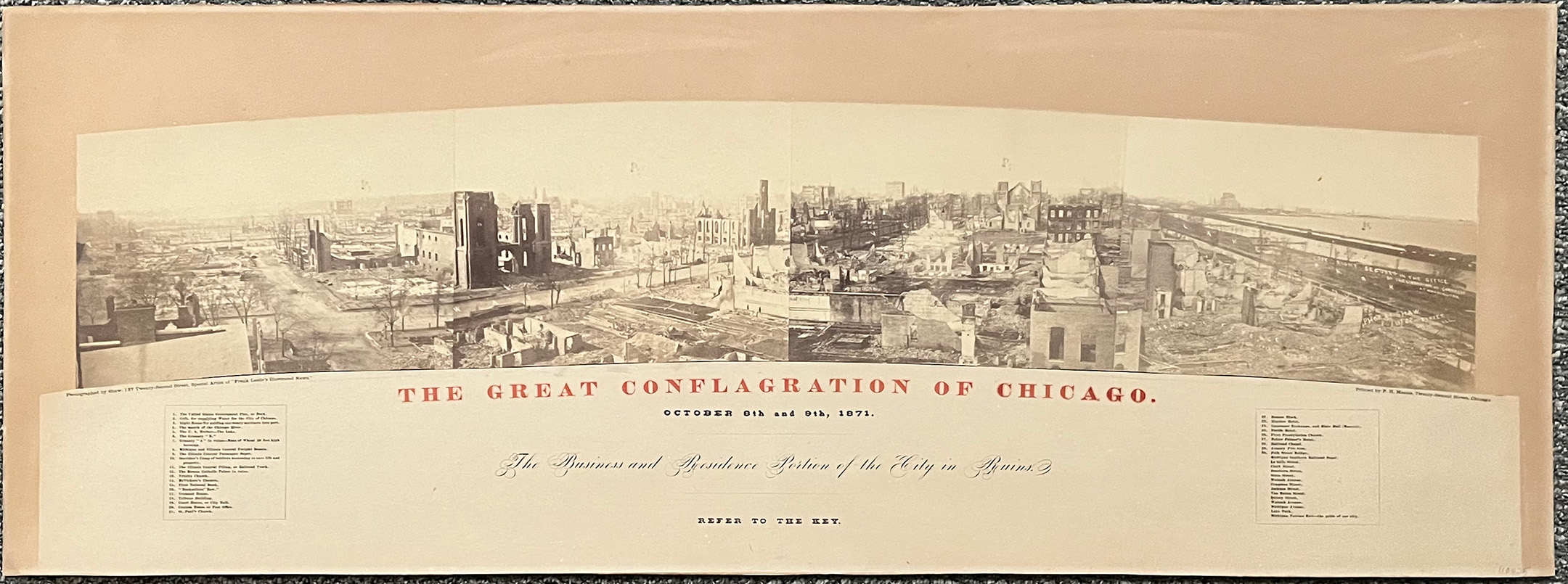A jumbo composite panoramic albumen photograph entitled THE GREAT CONFLAGRATION OF CHICAGO / OCTOBER 8TH AND 9TH, 1871. / The Business and Residence Portion of the City in Ruins / REFER TO THE KEY.