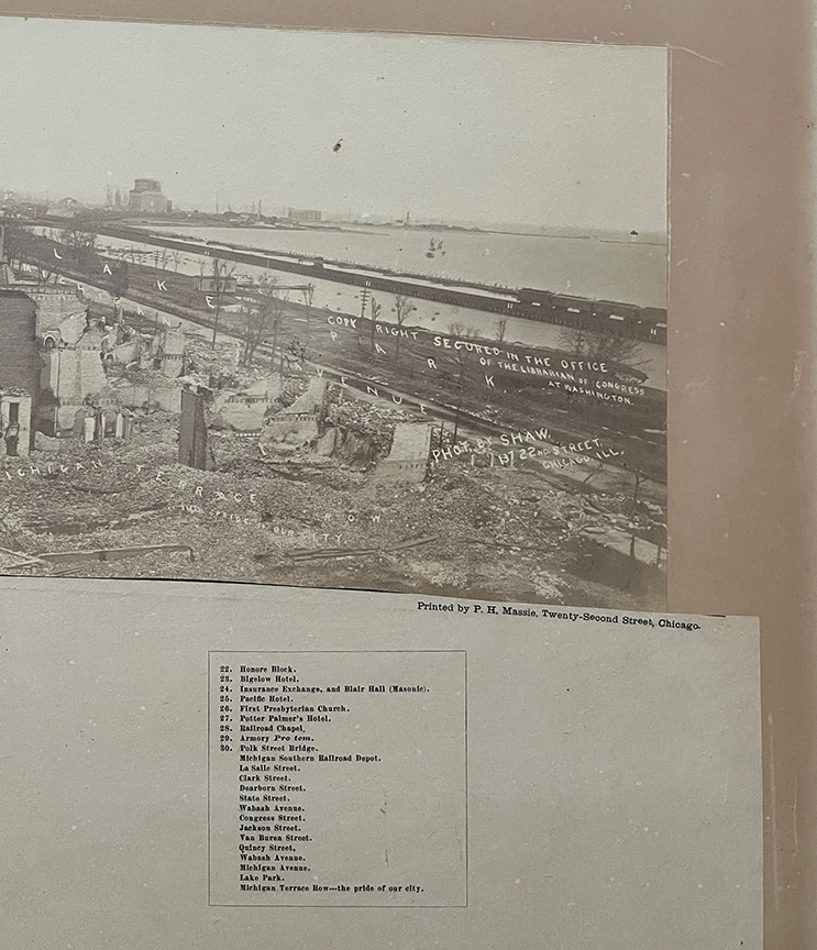 Four Albumen Photographs placed together in a slight arc (i.e. geometric curve) to produce a panoramic view of the burnt section of Chicago just after the Chicago Fire. The view is looking North from about Harrison Street. Just below is placed a title board, with the whole laid on a large backing board.