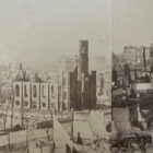 Shot five days after the Chicago Fire, Shaw was trying to portray an artistry in his documentation of the ruins; careful examination reveals that Shaw re-angled the camera at times to satisfy both. Mostly likely, Lesley’s Illustrated hired Shaw to record the damage for its woodcutters use in presenting that ruin to the nation.