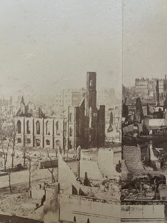 (Chicago Fire). William Shaw Jumbo Albumen Composite Photograph. Printed by F. H. Massie, Twenty-Second Street. 38” x 14-1/2” overall; each photograph approximately 9-1/4” x 6-1/4”.